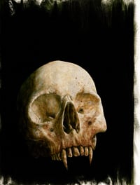 Sebastian Nabel is an artist that is based in Dresden, Germany. Whilst oil on paper is his main medium, Sebastian sometimes works with mixed media and has also been known to use his blood if he feels the work calls for it. His use of lighting when creating skull work is exceptional and his paintings have an aged, timeless feel to them. Often small in size, the originals look stunning when framed and it is easy to see why collectors are taking notice. His best known work is probably the album cover for SKOLD - DIES IRAE.